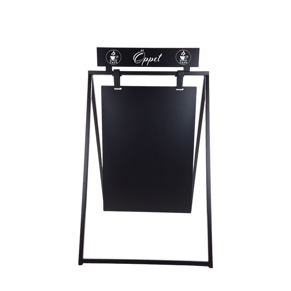 Denna gatupratare är framtagen för tydlig exponering vid entré och trottoar. Den magnetiska ytan gör det enkelt att byta budskap med affischer i 50×70 cm eller använda skylten som griffeltavla. För handskriven text finns schabloner som tillval.
