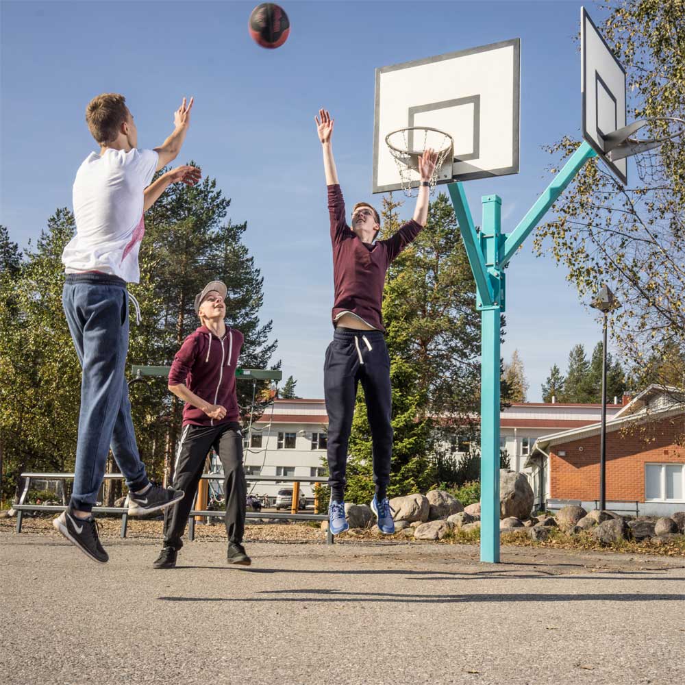 En basketställning med tre korgar som går att justera positionen i både vertikal och horisontell läge. Basketställningen finns i flera färger och går att matcha med övrig lekplatsutrustning på lekplatsen. Basketkorgarna har ett nät som är tillverkat av polyprolylen plast som gör näten både hållbara och slitstarka. En beständig basketställning som passar utmärkt att placera på lekplatsen, skolgården eller i parken.