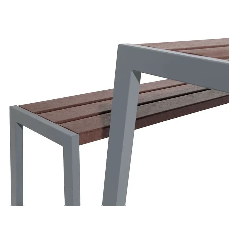 Bordsskiva och bänksitsar är tillverkade i återvunnen plast som kräver minimalt underhåll och klarar daglig användning i nordiskt klimat. Stommen är uppbyggd av zinkgrundade och pulverlackerade stålrör som ger stabilitet och lång livslängd.