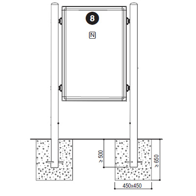 Detta skåp är extra tätat för att inte regn, kondens eller fukt ska komma in i skyltskåpet. För att det ska vara säkert att använda i offentliga miljöer där mycket människor rör sig är fronten av 4 mm splitterfritt glas och dörrarna har dubbla intrångskyddade lås samt slitstarka integrerade gångjärn som inte blir skeva. För att stå stabilt ska denna anslagstavla gjutas ner i marken. Stolparna är av kraftigt Ø114 mm stålrör med en svetsad välvd toppkåpa, allt lackad i en av våra RAL-färger.