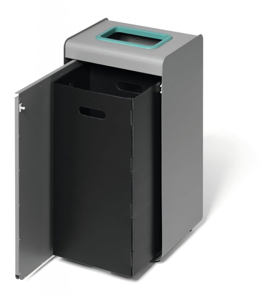 Kärlet är tillverkat i pulverlackad metall och har en tryck-och-öppna-mekanism som underlättar tömning och service. Innerbehållaren i plast rymmer 55 liter och är enkel att ta ur. Justerbara fötter säkerställer att kärlet står stabilt även på ojämna golv.