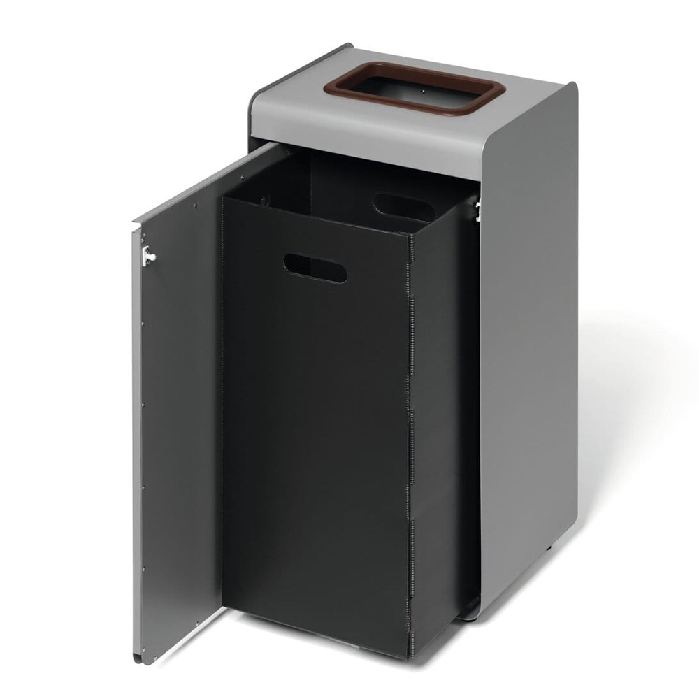 DURASORT® 55 liter är ett slitstarkt återvinningskärl i metall, framtaget för sortering av matavfall i inomhusmiljöer med daglig användning. Den bruna färgmarkeringen runt inkastet och den tydliga symbolen gör det enkelt att identifiera rätt fraktion – även i miljöer med många användare som skolor, personalutrymmen och matsalar.