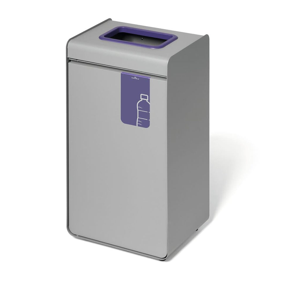 DURASORT® 55 liter är ett slitstarkt återvinningskärl i metall för plastförpackningar, framtaget för effektiv källsortering i miljöer med högt dagligt slitage. Den lila markerade öppningen och tydliga symbolen för plastförpackningar gör det enkelt att sortera rätt – även i skolor, matsalar och publika lokaler med många användare.