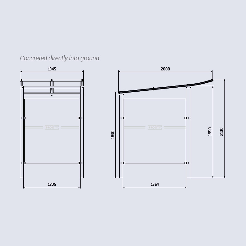 Tak: Anodiserade aluminiumprofiler, tvärstag i 40 × 40 mm stål samt 10 mm UV-behandlade kanalplastskivor